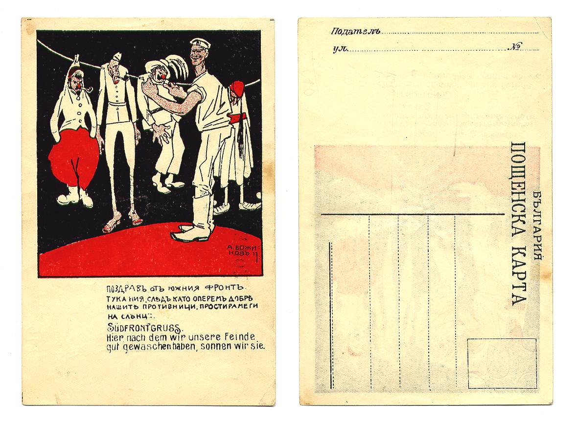 Nationalist politics in Eastern Europe soon turned against its neighbors as they struggled to define who their “people” were and came to a head on the eve of World War One. This is a propagandized postcard of that time illustrated by Alexander Bozhinov (Александър Божинов). The postcard depicts a satirical caricature of Bulgarian soldier hanging Greek, Serbian, Romanian, and French enemy soldiers like laundry.